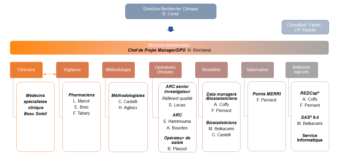 La promotion consiste au pilotage de A à Z des études de la clinique Beau Soleil depuis la conception, la mise en place, le suivi des participants, la gestion, l’analyse des données et la publication des résultats. La clinique est le responsable légal de l’étude. La sécurité des personnes est assurée par l’équipe vigilance et l’ensemble des étapes est réalisé dans le respect de la règlementation en vigueur.